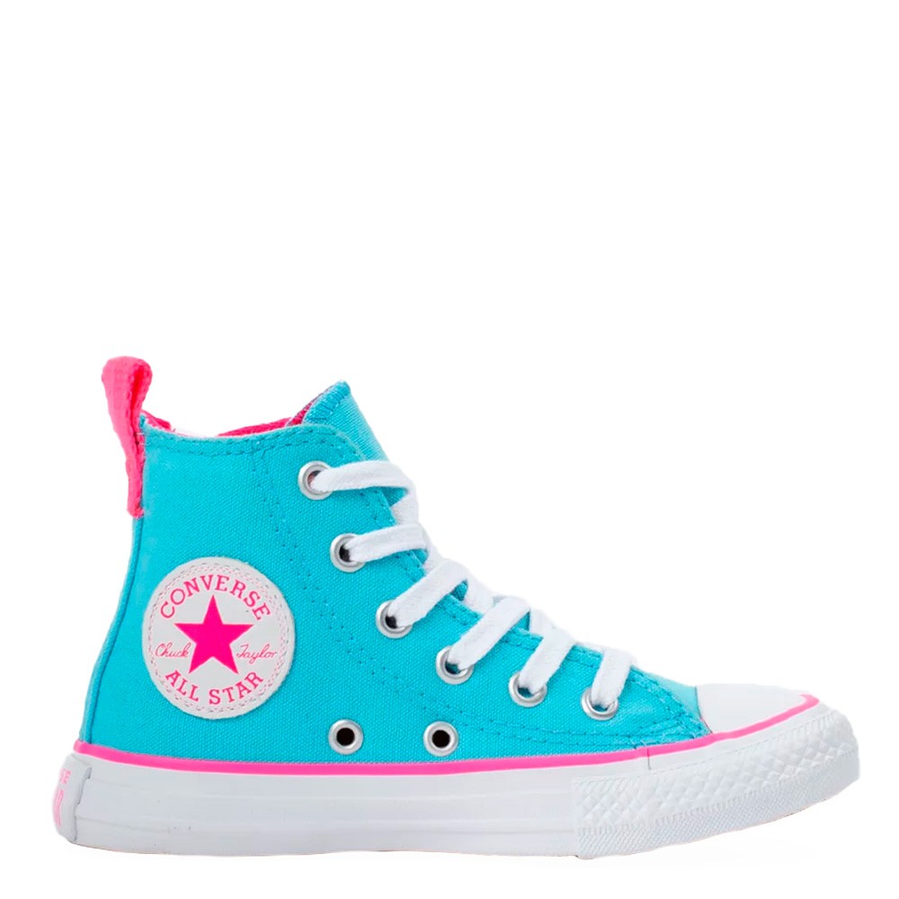 O clássico Chuck Taylor All Star nesta versão kids é confeccionado em tecido canvas de algodão tipo lona e vem nesta edição em cores sazonais. Possui costuras duplas, uma tira de tecido no calcanhar que proporciona maior suporte ao tênis e ilhoses na cor prateada, com dois ilhoses laterais para uma transpiração adequada aos pés. O logo Converse Chuck Taylor All Star é aplicado na parte interna dos canos e na Heeltab do calcanhar. Na parte externa dos canos é aplicado um zíper para vestir de forma mais prática. O solado vulcanizado garante a aderência adequada ao caminhar.
