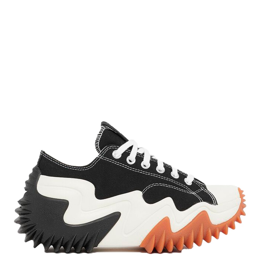 Este remix do clássico Converse Chuck Taylor All Star se chama Run Star Motion. Apresenta a típica parte superior em tecido preto com ilhós de renda reforçada, atacadores brancos e biqueira emborrachada, além de uma nova sola plataforma agressiva e tricolor.